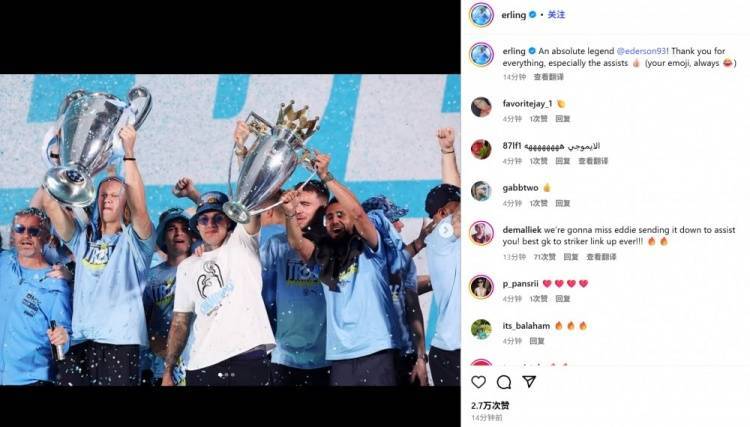 哈兰德晒出他与埃德森三冠王赛季共同庆祝的合照,并配文:“一位绝对的传奇人物@埃德森!谢谢你的一切,尤其是你的助攻👍🏻(你的表情符号,总是如此😂)”