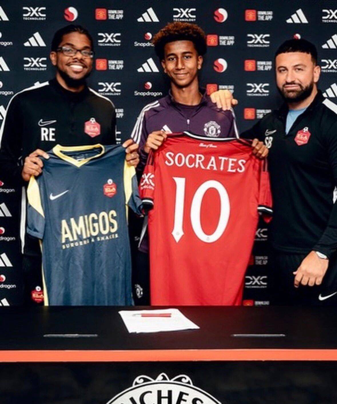 曼联签下的这个苏格拉底,出自ELA伦敦精英青训学院,曾先后在阿森纳、热刺和水晶宫试训,最终转会至曼联。13岁的苏格拉底最初是一名左边锋,但在改踢中后卫之后,才吸引了曼联球探的关注。然而,签约曼联时,苏格拉底拿着印有自己号码的10号球衣,他可能更想在老特拉福德冲锋陷阵,做一名攻击型球员。