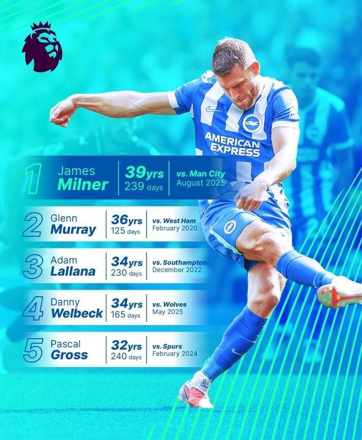 米尔纳在对阵曼城的比赛中破门,以39岁239天成为布莱顿英超最年长进球者。